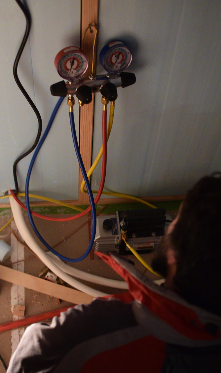 Published January 5, 2016 at 892 × 1500 in Lights, Water, Gas, Heat, ACTION! Brad watching the gauges as he “pulls a vacuum” on our mini-split lines to test for leaks. ‹ Return to post Leave a ReplyCancel reply