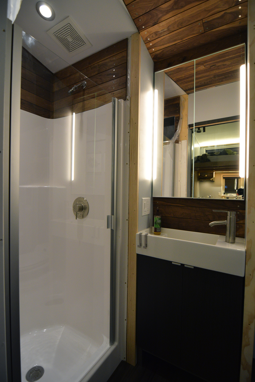 We choose a shower door because we wanted to avoid having a plastic shower curtain stick to us when we are in the small 32″ shower. We choose clear glass (instead of a translucent glass) with hopes that the space will feel larger (both when you are inside and outside of the shower) by eliminating a visual partition that would divide the already small space.